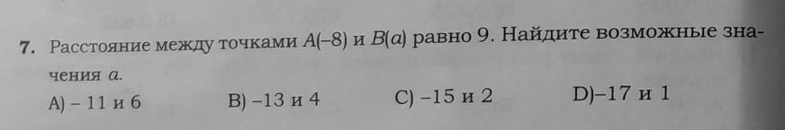 Расстояние между точками А(-8) и В(а) равное 9 соответствует варианту D) -17 и 1, т. к.