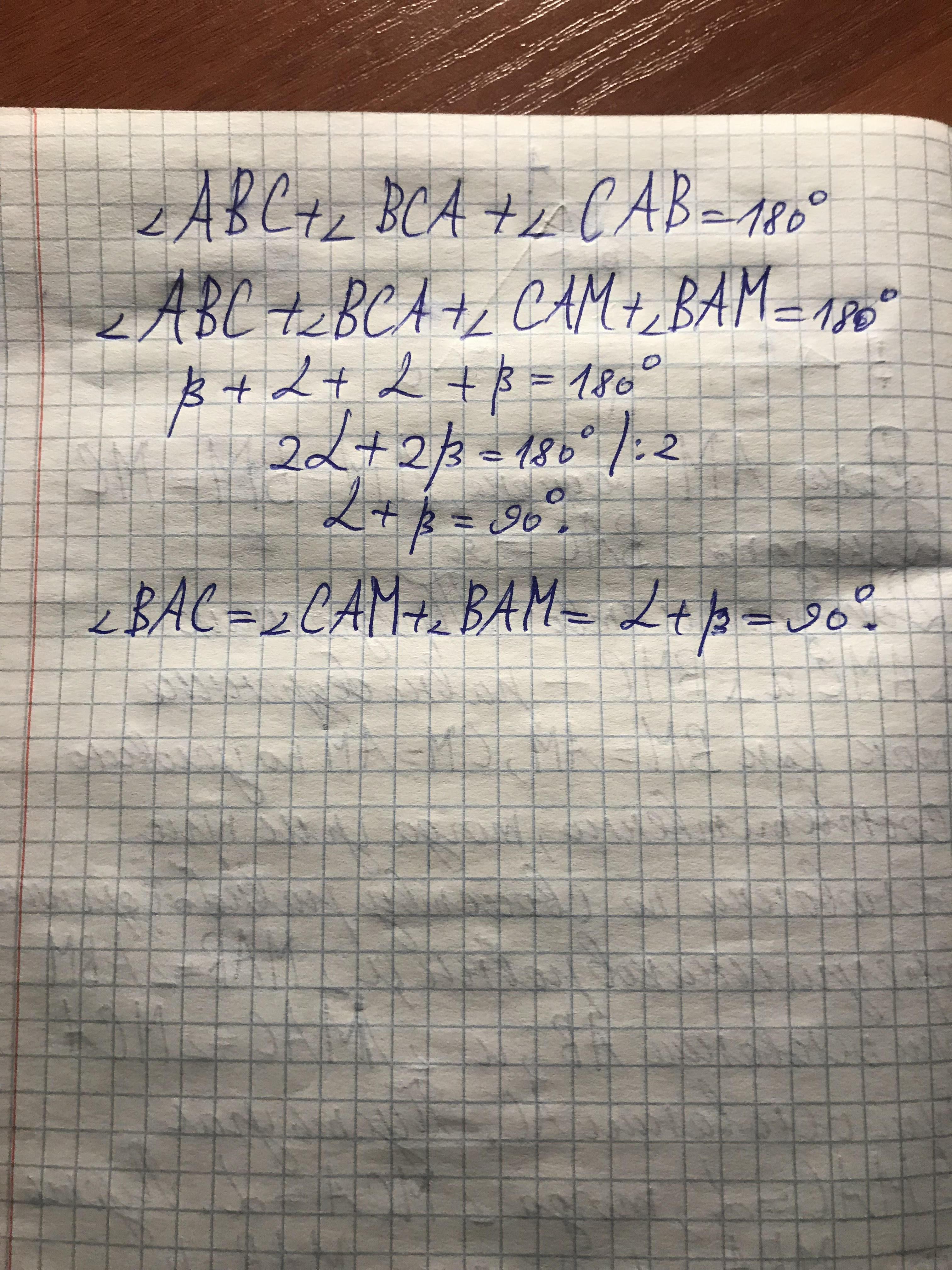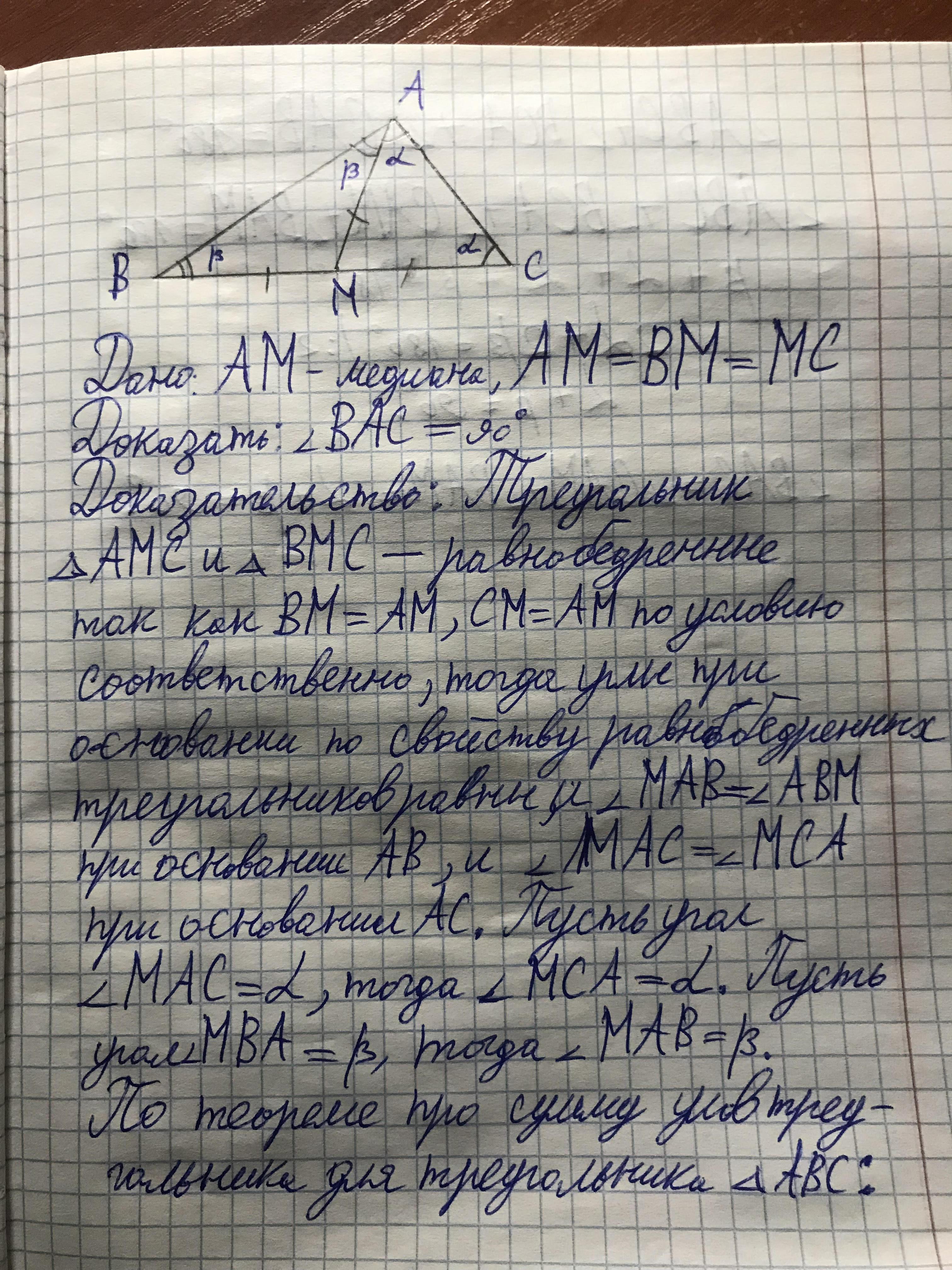 30 баллов! в треугольнике abc проведена медиана am, так, что am=bm=mc. докажите, что треугольник abc прямоугольный