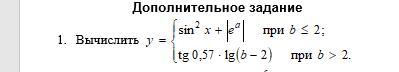 y:=(b>2)? tan(0.57)*log(b-2):sin(x).Sqr+abs((power(e,a)));