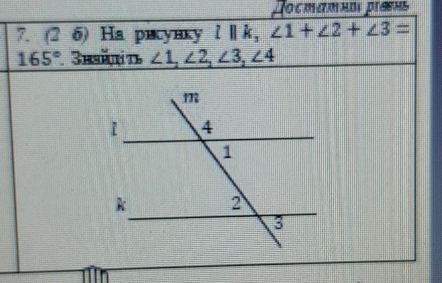 L паралельна кут 1+кут 2+кут 3=165 градусів,Знайдіть кут 1 кут 2 кут 3 та кут 4