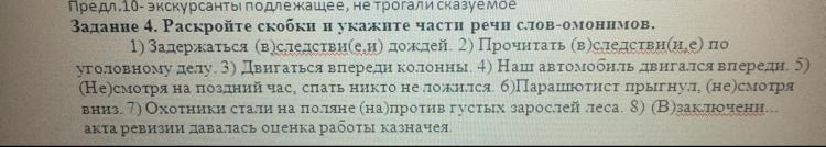 1) Задержаться вследствие дождей. 2) Прочитать в следствии по уголовному делу. 3) Двигаться впереди колонны. 4) Наш автомобиль двигался впереди. 5) Несмотря на поздний час, спать никто не ложился.