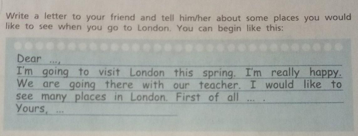 Ответ:Dear *Ann* I'm going to visit London this spring. I'm really happy. We are going there with our teacher. I would like to see many places in London. First of all : Big-Ben, Hyde-Park and the London Eye. Yours, Betty.