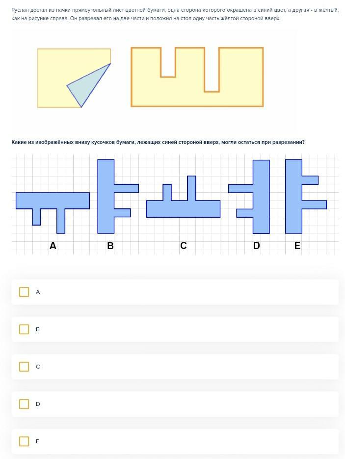 По идее, стороны листа зеркальны, я действовал методом исключения. A - не подходит, так как так выглядит фигура жёлтого цвета, которая осталось. Остальные не подходят, из-за поворота в другую сторону.
