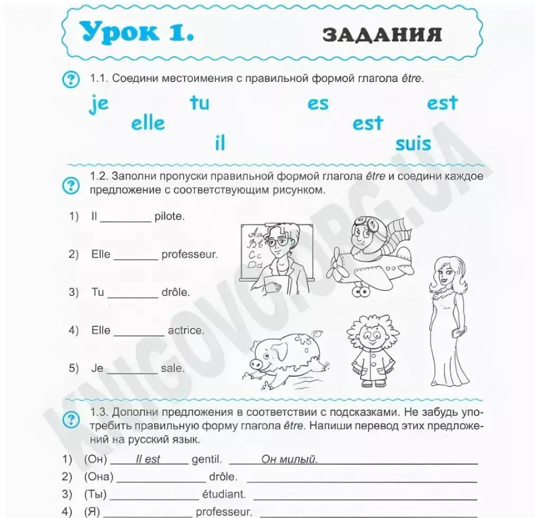 1) est 2) est 3) es 4) est 5 suis 1.1 je suis, elle est, ill est, tu es 1.3 2) Elle est drole она смешная 2) tu es etudiant ты студент 3) je suis Professeur я учитель