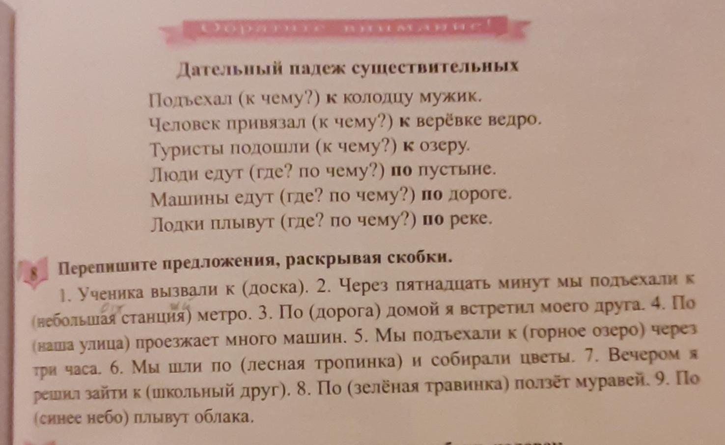 1 Ученика вызвали к доске. 2. Через пятнадцать минут мы подъехали к небольшой станции метро. 3. По дороге домой я встретил моего друга. 4. По нашей улице проезжает много машин. 5. Мы подъехали к горному озеру через три часа. 6. Мы шли по лесной тропинке и собирали цветы. 7. Вечером я решил зайти к школьному другу. 8. По зеленой травинке ползёт муравей. 9. По синему небу плывут облака.