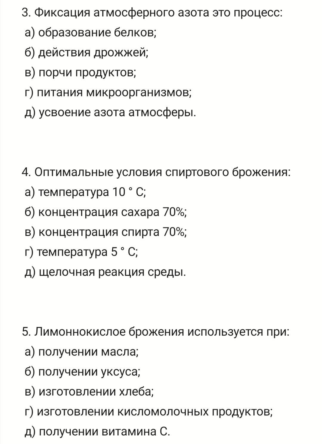 Объяснение: Брожение должно протекать в кислой среде, т.е pH<7 так что ответ д) убираем. Далее, концентрация сахара не должна быть выше 30 процентов иначе брожение прекращается, значит нам не подходит ответ б). Концентрация спирта неблагоприятно влияет на сами дрожжи уже при концентрации более двух процентов, ответ в) отбрасываем. Чем ниже температура, тем дольше происходит процесс брожения, но он не прекращается. Нам подходят оба варианта а) и г).