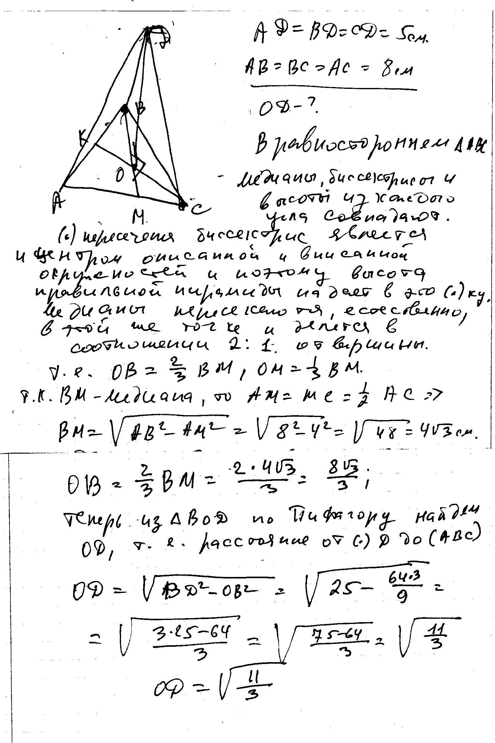 Расстояние от вершин равностороннего треугольника АВС до точки Д равно 5 см. Найдите расстояние от точки Д до плоскости АВС,если АВ=8см.