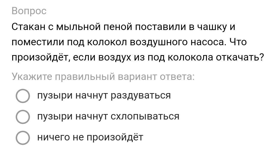 Ответ: При откачивании воздуха из-под колокола внутреннее давление воздуха в пузырях становится больше внешнего давления, поэтому пузыри раздуваются.