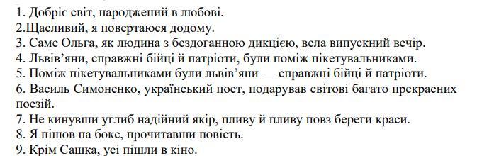 Записати речення, у дужках пояснити розділові знаки – написати вид ускладненого речення, використовуючи терміни: речення ускладнені означенням (дієприкметниковим зворотом), додатком, обставиною (дієприслівниковим зворотом), однорідними членами речення, вставними словами, прикладкою, уточнюючими членами речення, звертанням.