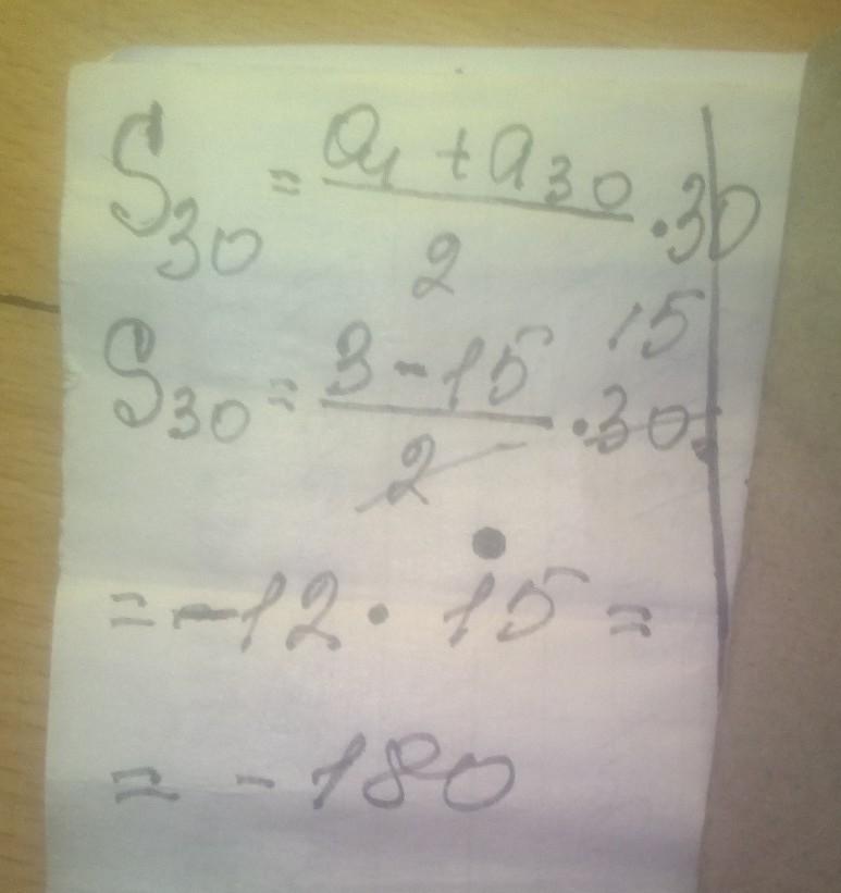 3. В арифметической прогрессии a1 = 3 и a30 = -15 .Найдите сумму первых тридцати членов.