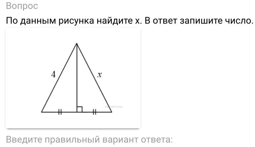 Это треугольник ABC, у него есть биссектриса BM. Тр ABM=BMC, т.к. AM =MC, BM общая сторона, угол BMА и BMC равны, т.к. они смежные, теперь сторона BC(x)=AB, т.к. это соответствующие стороны равных треугольников, значит х=4
