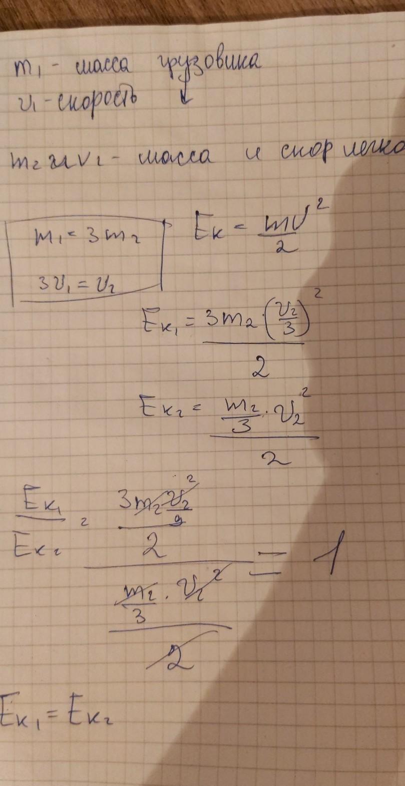 Масса камаза больше массы легкового автомобиля в 3 раза, но скорость легкового в 3 раза больше. Найдите отношение кинетических энергий.