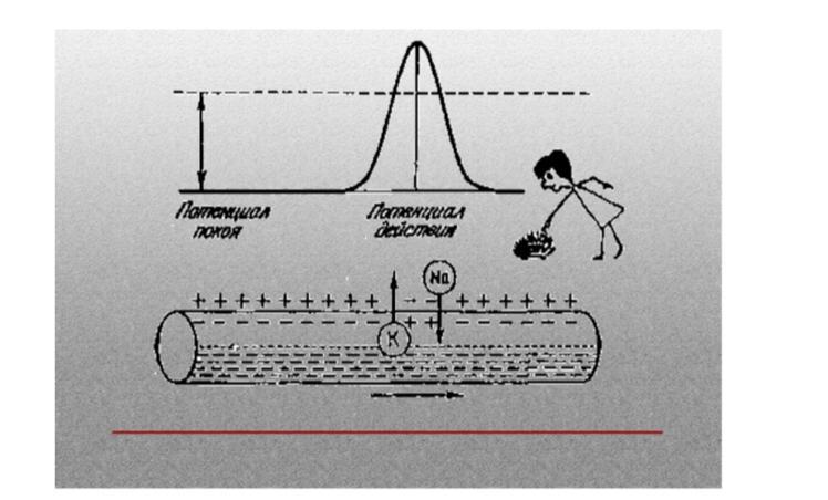 Проницаемость мембраны для ионов разная. Концентрация ионов калия выше в клетке, ионов натрия снаружи. В состоянии покоя клеточная мембрана снаружи клетки заряжена положительно, внутри клетки - отрицательно. Когда происходит возбуждение, часть мембраны меняет проницаемость и ионы натрия начинают поступать внутрь клетки, а ионы калия наружу. Мембрана деполяризуется, то есть ставится внутри положительно заряженной, а снаружи - отрицательно заряженной.