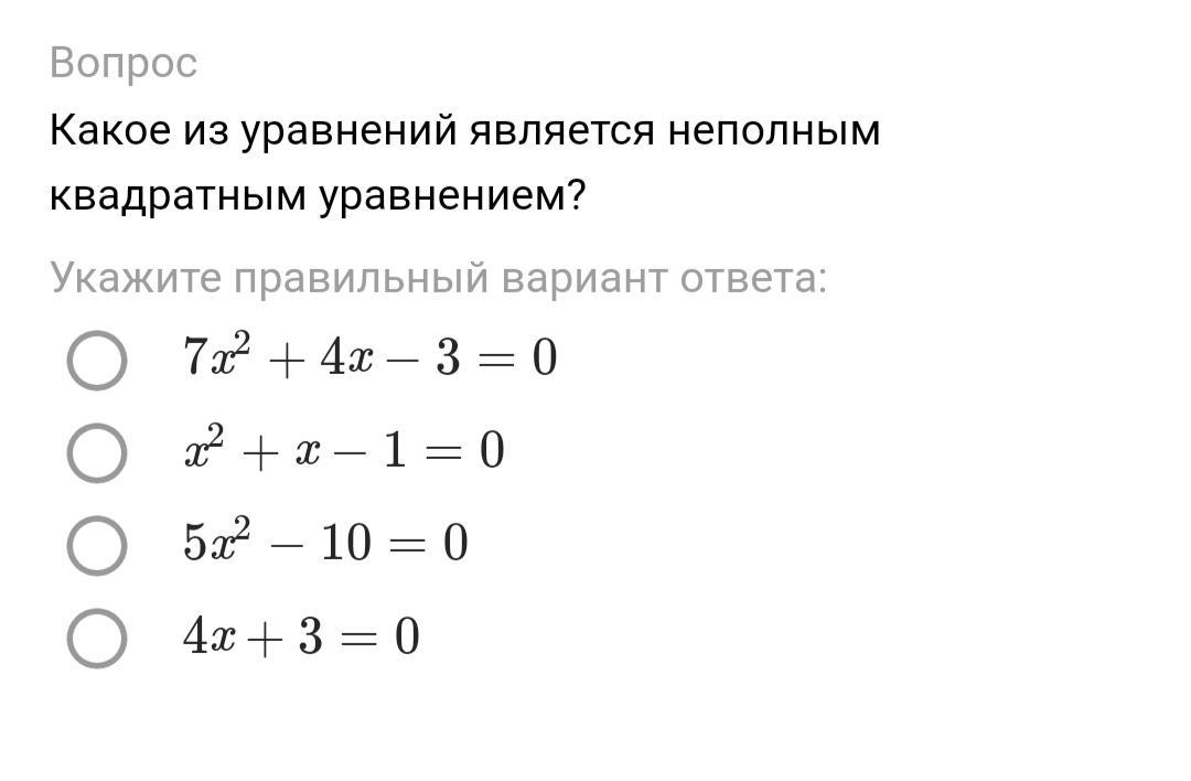 Объяснение: Неполное квадратное уравнение () - это уравнения у которого коэффициент "b" или "с" равен нулю. Если посмотреть на ответы то первый и второй вариант не являются неполными т.к у обоих есть коэффициенты b и c (на втором варианте коэффициент b = 1x).