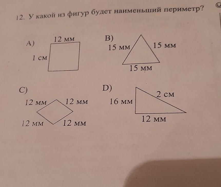 наименьший периметр у прямоугольника, ответ а) 4 см 4 мм