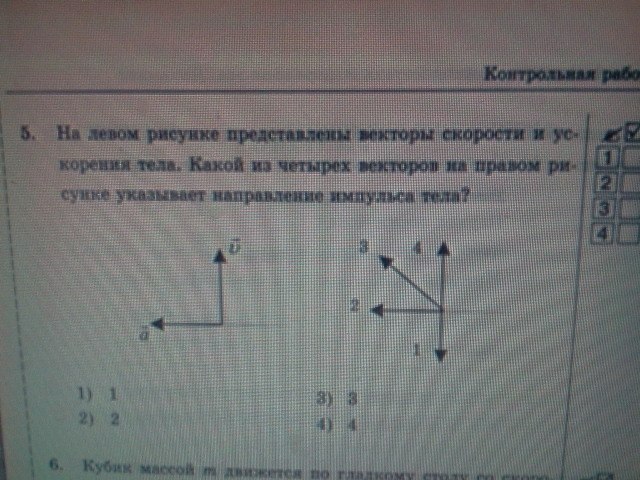 на левом рисунке представлены векторы скорости и ускорения тела.какой из четырех векторов на правом рисунке указывает направление импульса тела?