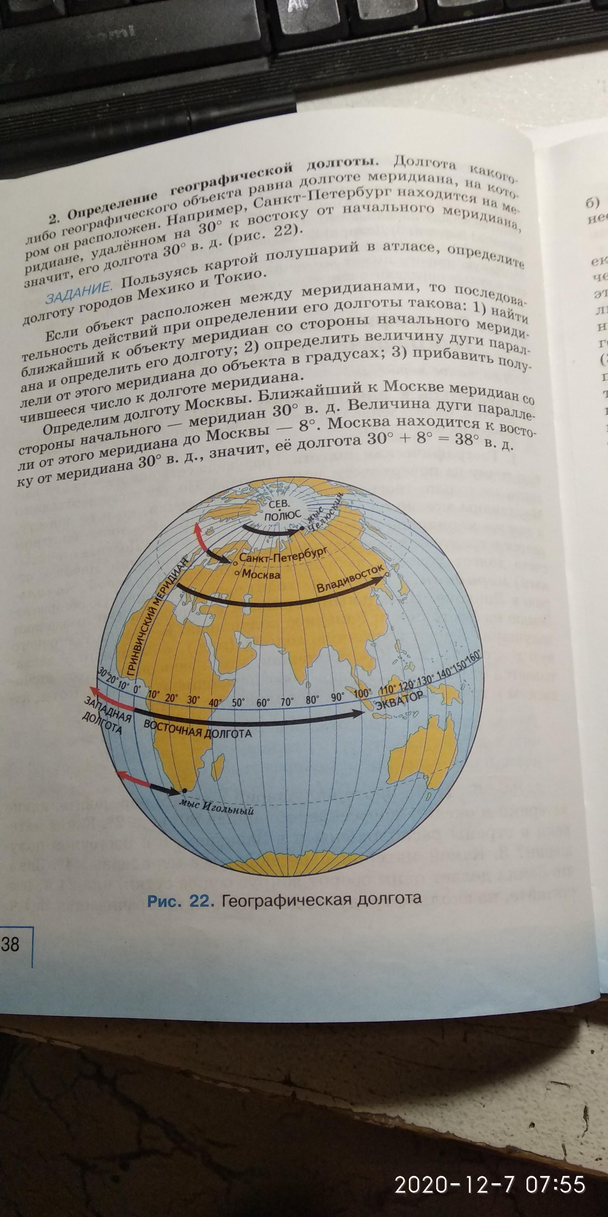 задание 6 класс параграф 12. задание в тетради. Определить географическую долготу по рисунку 22 страница 38