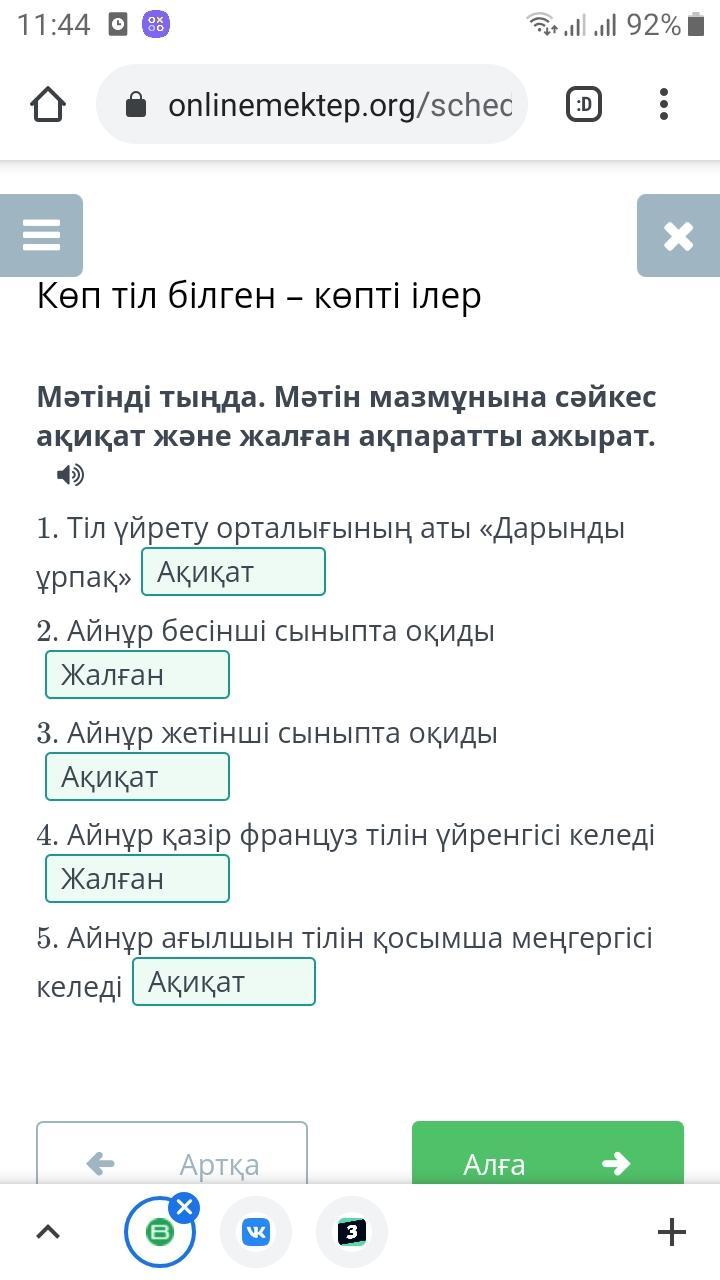 Мәтінді тыңда. Мәтін мазмұнына сәйкес ақиқат және жалған ақпаратты ажырат.