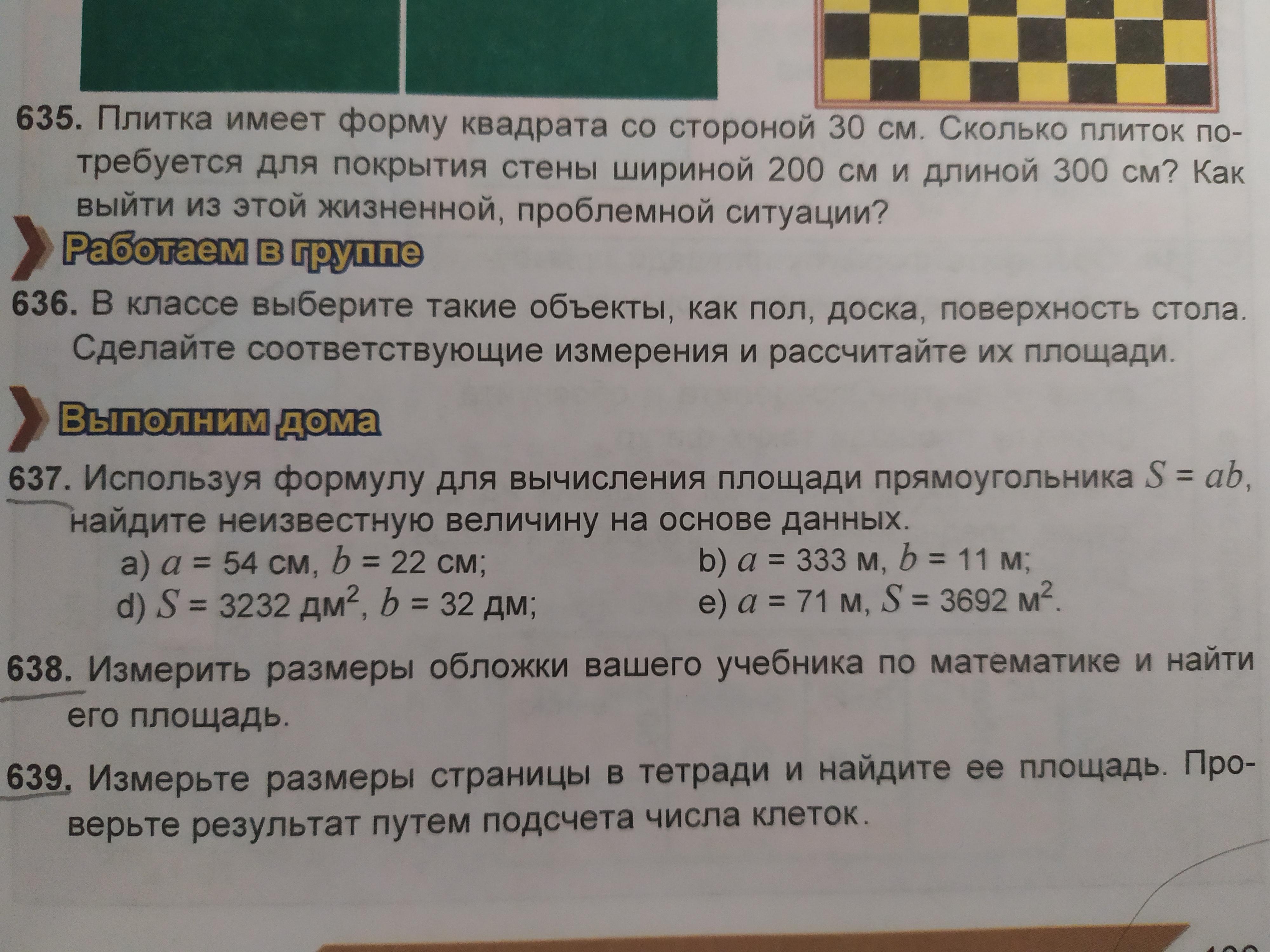 #637 Используя формулу для вычисления площади прямоугольника S = ab, найдите неизвестную величину на основе данных