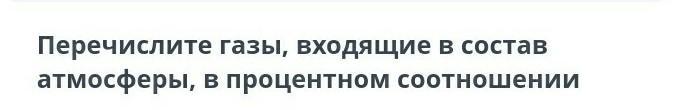 В газовый состав атмосферы входят, главным образом, азот (≈78%) и кислород (≈21%). Доля остальных газов (углекислый газ, аргон, неон, радон, гелий, криптон, водород, метан, закись азота и озон) составляют примерно 1%.