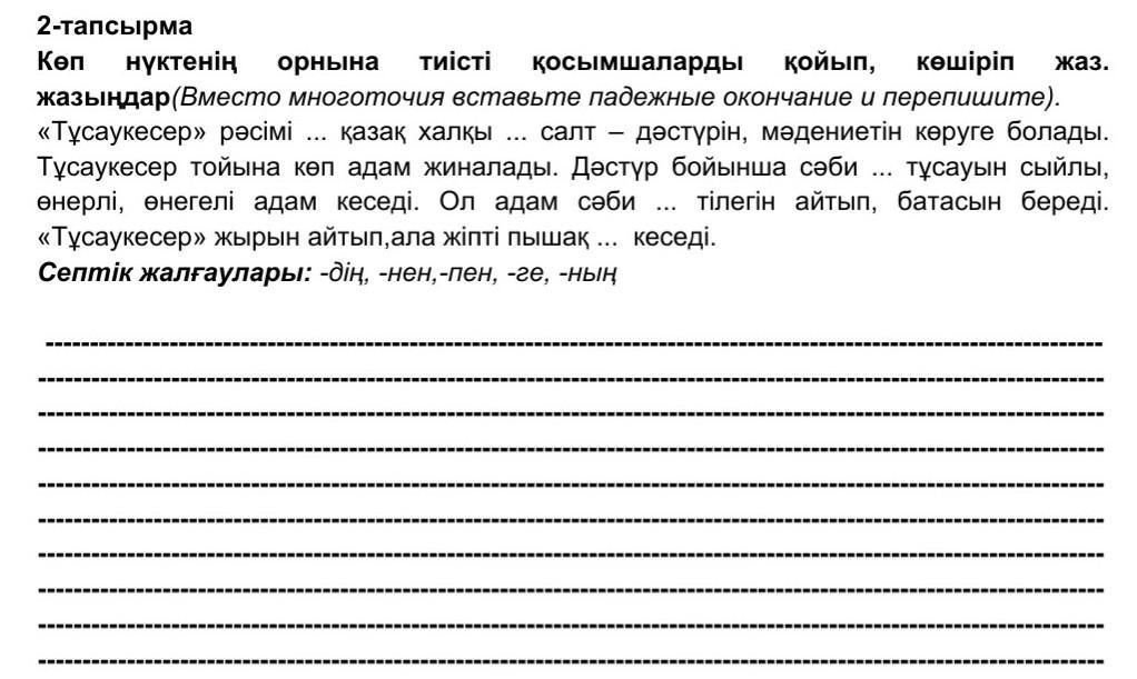 《Тұсаукесер》рәсімінен қазақ халқының салт-дәстүрін, мәдениетін көруге болады. Тұсаукесер тойына көп адам жиналады. Дәстүр бойына сәбидің тұсауын сыйлы, өнерлі, өнегелі адам кеседі. Ол адам сәбиге тілегін айтып, батасын береді. 《Тұсаукесер》жырын айтып, ала жіпті пышақпен кеседі.