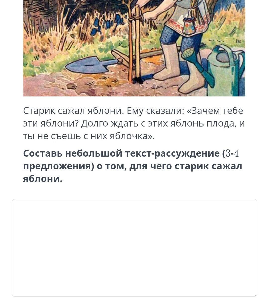 Старик сажал яблони хоть и знал что не доживёт до того момента как расцветут плоды. Зачем же он их сажал? я думаю он сажал яблони что бы другие люди вкусили плоды яблонь. Он очень добрый человек. Он думает не только о себе но, и о других