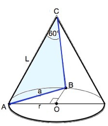 Сечение, ограниченное двумя равными образующими АС и ВС, угол между которыми 60°, и хордой АВ - равносторонний треугольник, так как его углы при АВ равны 60°.