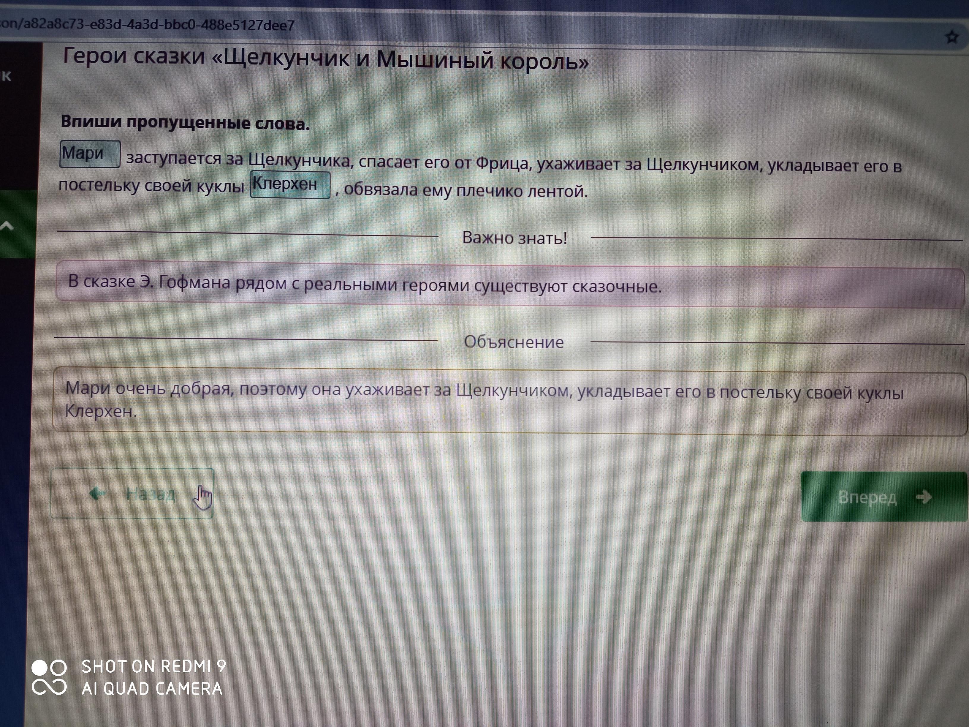 заступается за Щелкунчика, спасает его от Фрица, ухаживает за Щелкунчиком, укладывает его в постельку своей куклы