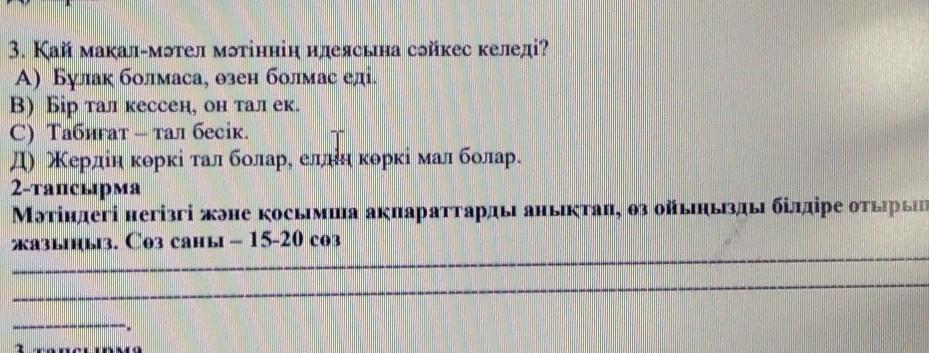кай макал мәтел мәтіннің идеясына сәйкес келеді а) Булак болмаса өзен болмас еді б) бир тал кесең он талек в) табигат тал бесик д) жердин корки тал болар елдің корки мал болар очыеки тап керек срочно