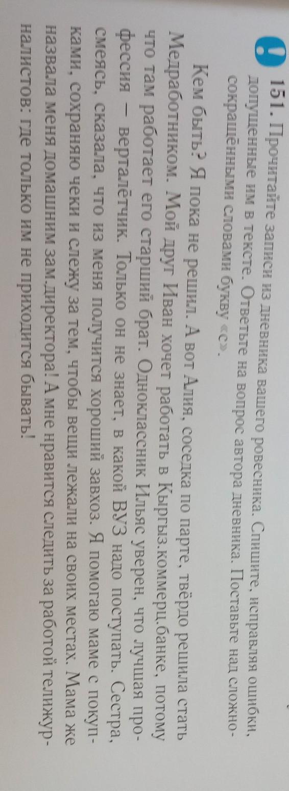 Кем быть? Я пока не решил. А вот Алия,соседка по парте, твердо решила стать медработником(с). Мой друг Иван хочет работать в Кыргыз.Коммерц.банке(с), потому что там работает его старший брат. Одноклассник Ильяс уверен, что лучшая профессия - вертолётчик. Только он не знает, в какой ВУЗ надо поступать. Сестра, смеясь, сказала, что из меня получится хороший завхоз(с). Я помогаю маме с покупками, сохраняю чеки и слежу за тем, чтобы вещи лежали на своих местах. Мама же назвала меня домашним заместителем директора! А мне нравится следить за работой тележурналистов: где только им не приходится бывать!