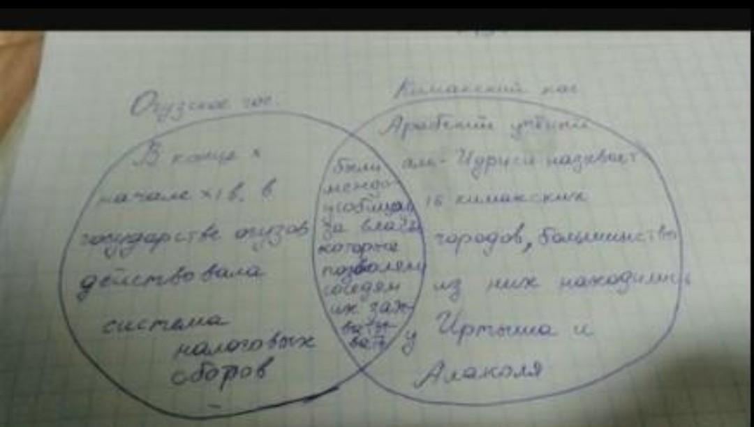 2. Заполните диаграмму Венна. Найдите сходства и различия государства Огузов и Кимакского каганата. Чтобы не чертить диаграмму сделайте таблицу, справа напишите сходство, а слева различия.