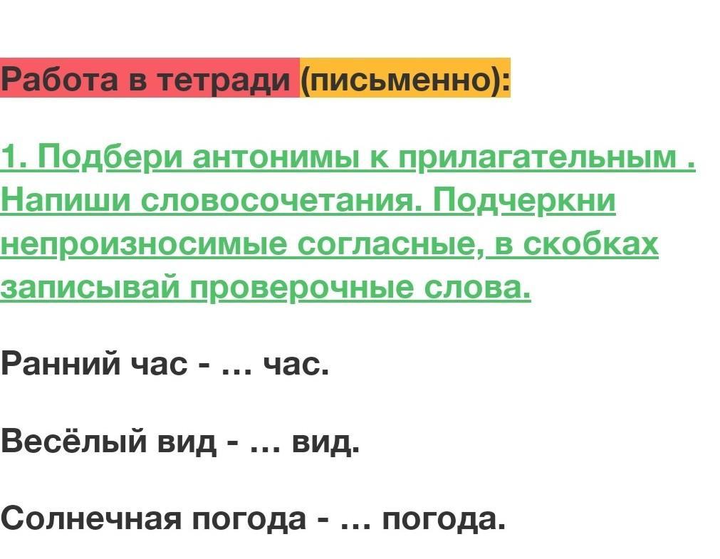 Подбери антонимы к прилагательным . Напиши словосочетания. Подчеркни непроизносимые согласные, в скобках записывай проверочные слова.