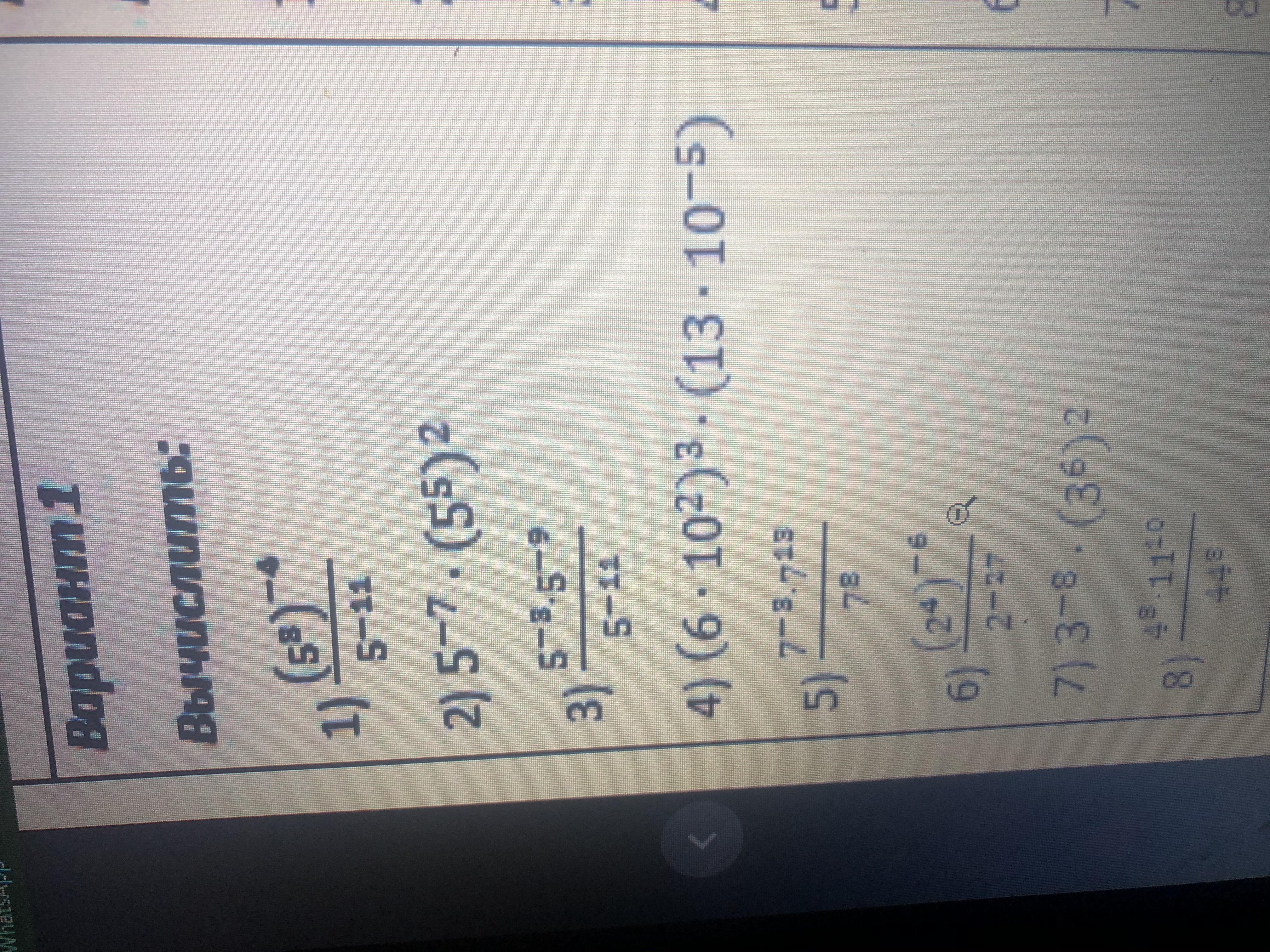 1)\ \ \dfrac{(5^8)^{-4}}{5^{-11}}=\dfrac{5^{-32}}{5^{-11}}=\dfrac{1}{5^{21}}\ \ \ ;\ \ \ \dfrac{(5^3)^{-4}}{5^{-11}}=\dfrac{5^{-12}}{5^{-11}}=5^{-1}=\dfrac{1}{5}\\\\\\2)\ \ 5^{-7}\cdot (5^5)^2=5^{-7}\cdot 5^{10}=5^{-7+10}=5^3=125\\\\\\3)\ \ \dfrac{5^{-8}\cdot 5^{-9}}{5^{-11}}=\dfrac{5^{-17}}{5^{-11}}=\dfrac{1}{5^6}\ \ \ ;\ \ \ \dfrac{5^{-3}\cdot 5^{-9}}{5^{-11}}=\dfrac{5^{-12}}{5^{-11}}=\dfrac{1}{5}\\\\\\4)\ \ (6\cdot 10^2)^3\cdot (13\cdot 10^{-5})=6^3\cdot 10^6\cdot 13\cdot 10^{-5}=2808\cdot 10=28080