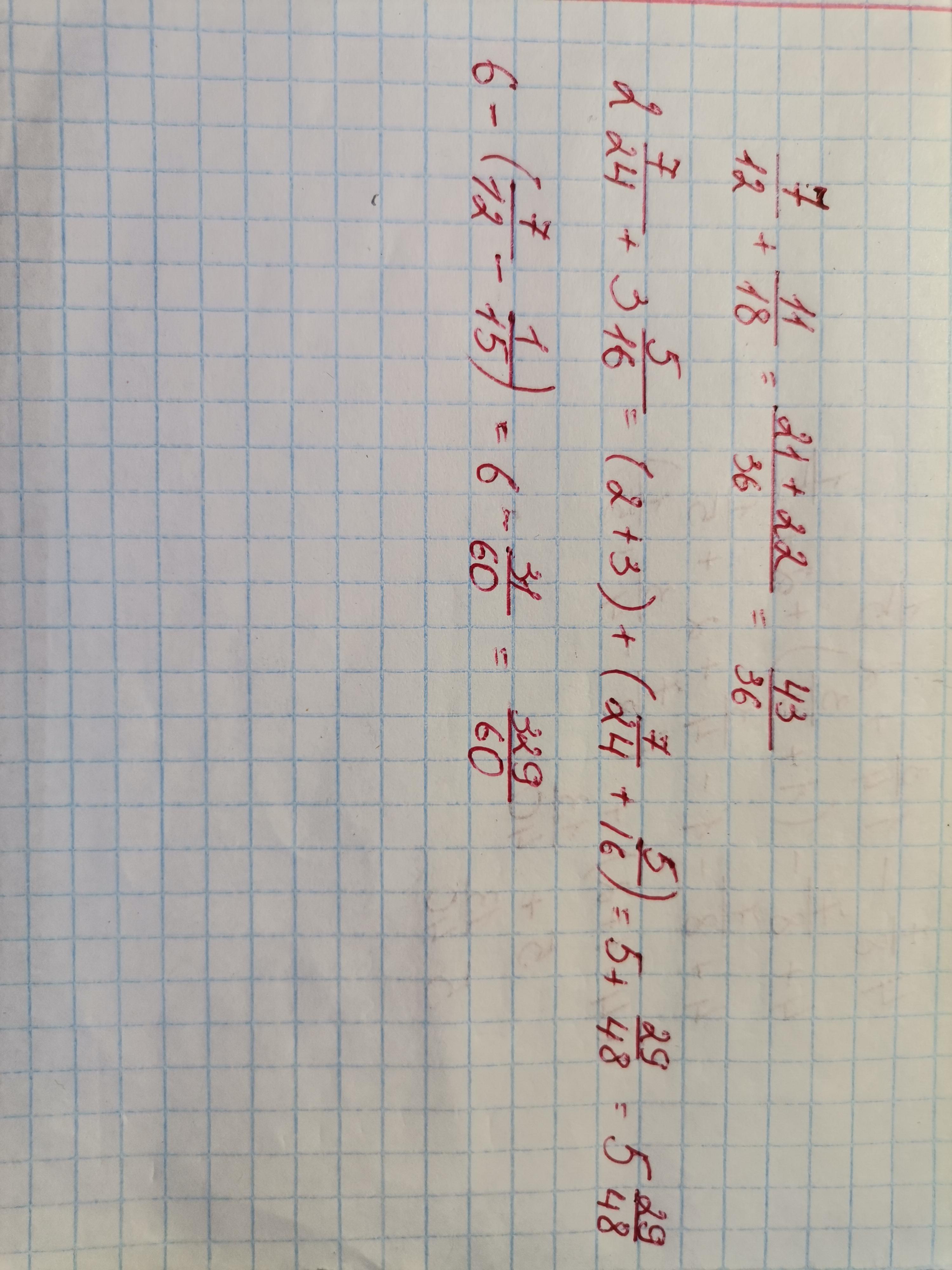 1) 7/12 + 11/18 = домножаем первую дробь на 3, вторую на 2 = 21/ 36 + 22/36 = 43/36 = 1_7/36