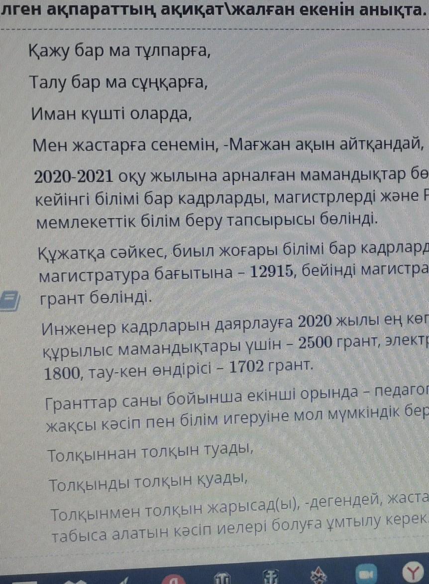 Берілген ақпараттың ақиқатіжалған екенін анықта . 1. « Мен жастарға сенемін » деп Мағжан Жұмабаев айтты . Ақиқат 2. Соңғы екі жылда PhD докторларын даярлауға арналған мемлекеттік білім беру тапсырысы көбейді 3. Биылғы жылы жалпы магистратураға 13825 грант бөлінді . Жалған