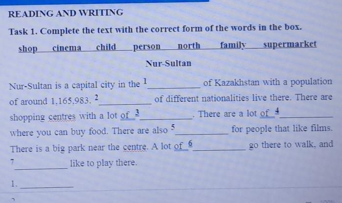 1. North, 2 people, 3 shops 4 supermarkets 5 cinema 6 families 7 children