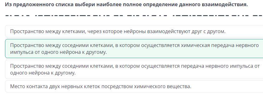 На рисунке изображено место контакта двух нейронов. Из предложенного списка выбери наиболее полное определение данного взаимодействия. Пространство между соседними клетками, в котором осуществляется Химическая передача нервного импульса от одного нейрона к другому. Пространство между соседними клетками, в котором осуществляется передача нервного импульса от одного нейрона к другому, Пространство между клетками, через которое нейроны взаимодействуют друг с другом. Место контакта двух нервных клеток посредством химического вещества.