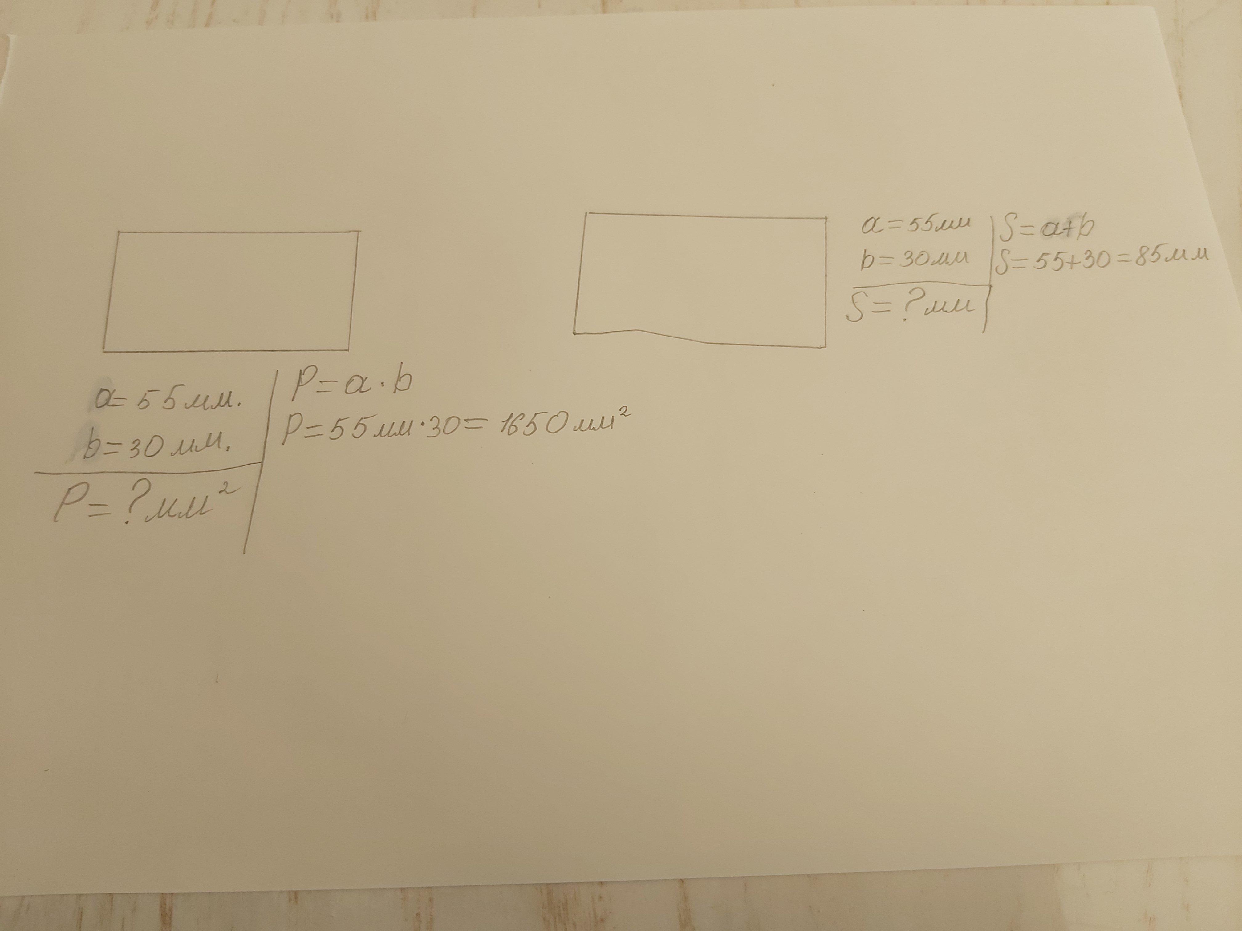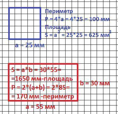 Начерти квадрат со стороной 25 мм прямоугольник ширина 30 мм длина 55 мм Вычисли их периметр и площадь