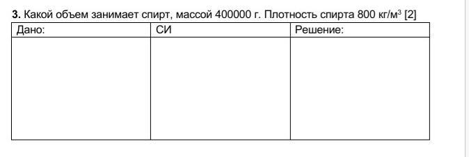 3. Какой объем занимает спирт, массой 400000 г. Плотность спирта 800 кг/м3 [2]
