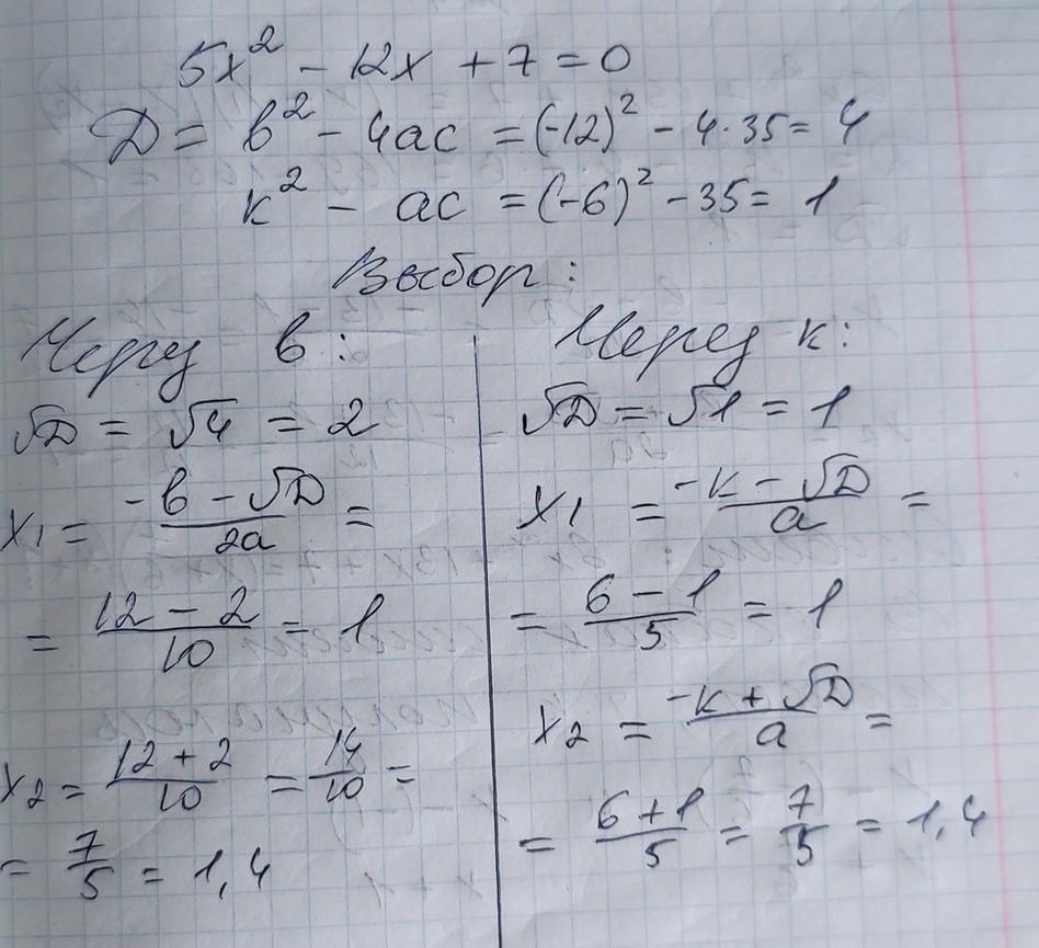 2.решите уравнение с помощью вычисленных дискриминанта 5х^2-12х+7=0.