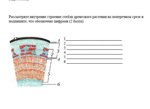 Рассмотрите внутренне строение стебля древесного растения на поперечном срезе и подпишите, что обозначено цифрами.