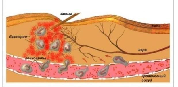 При попадании инородного тела в дерму кожи - занозы, вместе с ней были занесены и бактерии. Они выделяют продукты своей жизнедеятельности во внутреннюю среду организма, чем и привлекают иммунные клетки нашего организма - нейтрофилов. Это самый многочисленный вид лейкоцитов, осуществляющий весь основной фагоцитоз. Они путём хемотаксиса (чувствительности к хим. веществу) идут с током крови к месту бактериального проникновения. Находящиеся вблизи тучные клетки кожи запускают аллергическую реакцию, выделяя особое вещество - гистамин. Так просто лейкоцит не прошёл бы стенку кровеносного капилляра, а вот гистамин обеспечивает образование отёка - он расширяет капилляр и в нём скапливается жидкость, при этом клетки капилляра расходятся и дают место для того, чтобы лейкоцит проник к бактериям. Это мы и видим на рисунке - в месте проникновения лейкоцитов сосуд расширен и клетки находятся на расстоянии друг от друга. Далее всё будет по принципу сложной иммунной реакции, но в основе будет лежать фагоцитирование бактерий этими самыми нейтрофилами.
