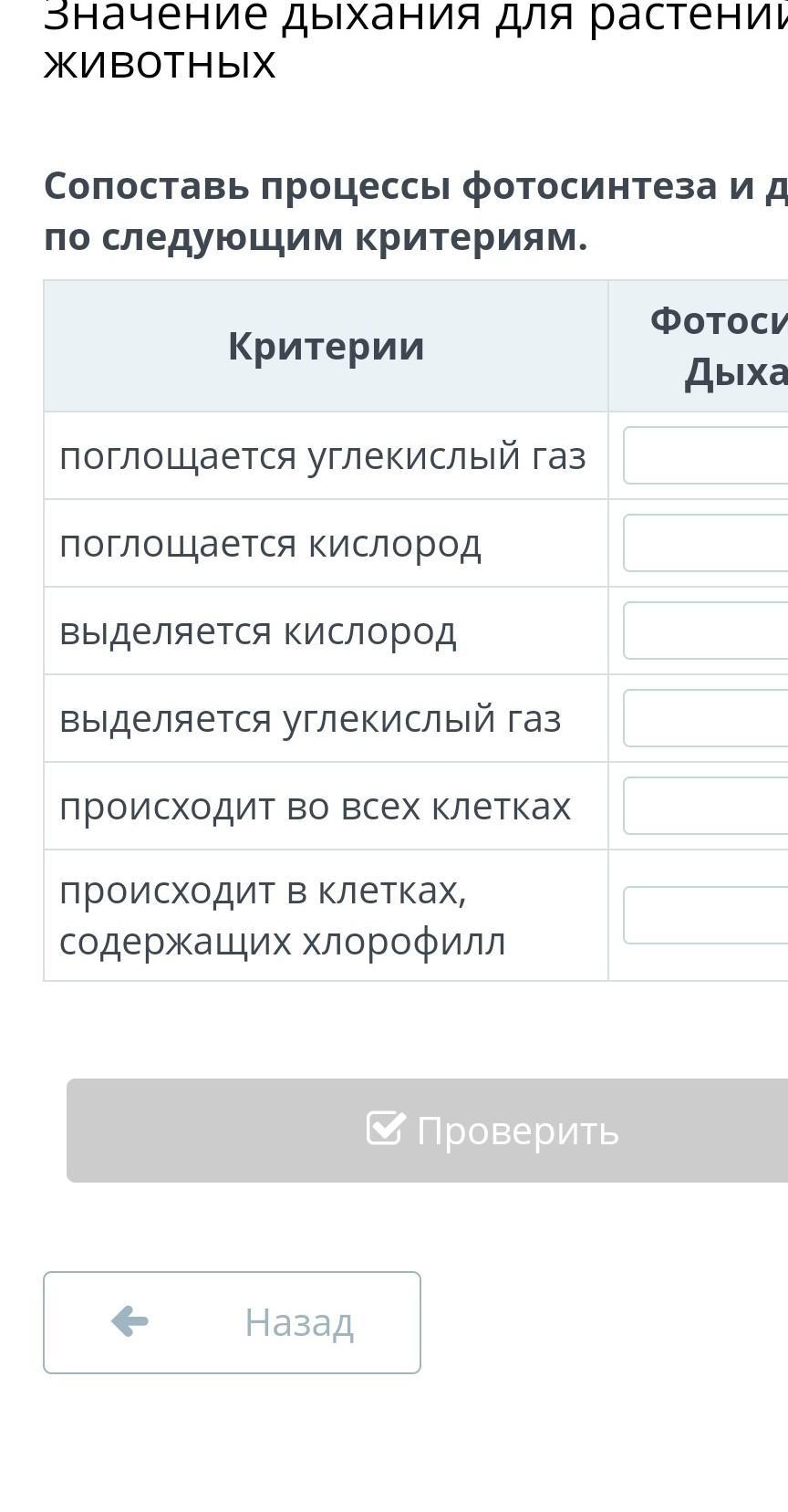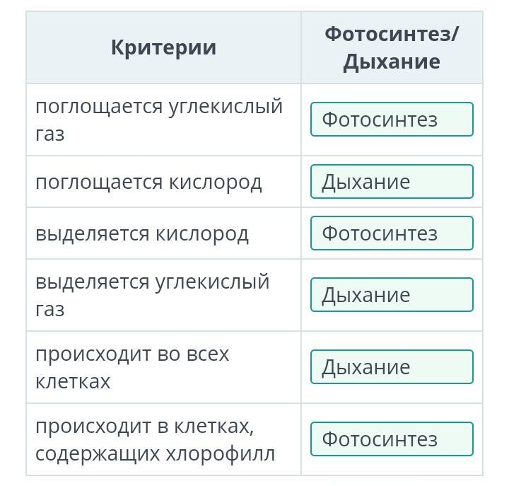 Сопоставь процессы фотосинтеза и дыхания по следующим критериям.
