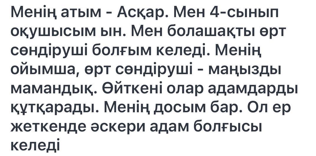 Менің атым - Асқар. Мен 4-сынып оқушысым ын. Мен болашақты өрт сөндіруші болғым келеді. Менің ойымша, өрт сөндіруші - маңызды мамандық. Өйткені олар адамдарды құтқарады. Менің досым бар. Ол ер жеткенде әскери адам болғысы келеді