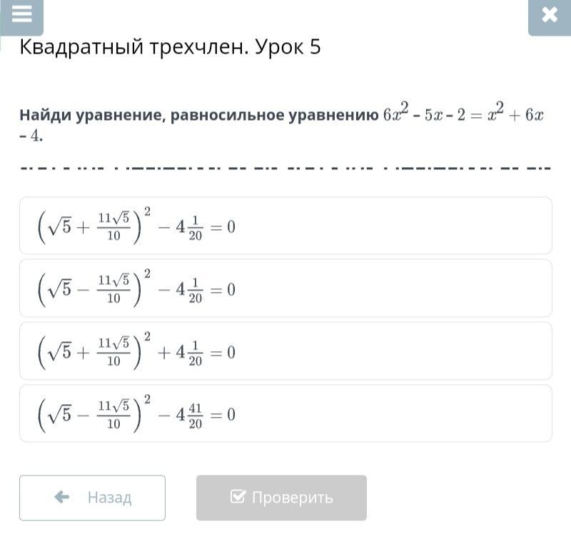 Найди уравнение, равносильное уравнению 6x^2 – 5x – 2 = x^2 + 6x – 4.