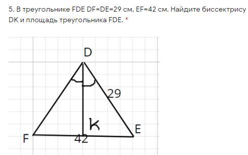 По т. Пифагора DK=√(DE²-EK²)=√(29²-21²)=20 см - биссектриса и высота - h.