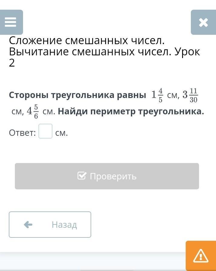 Стороны трекгольника равны 1 4/5 см, 3 11/30 см, 4 5/6 см. Найди периметр треугольника.