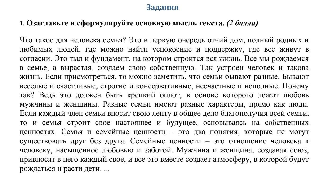 1. Озаглавьте и сформулируйте основную мысль текста. (2 балла) Что такое для человека семья? Это в первую очередь отчий дом, полный родных и любимых людей, где можно найти успокоение и поддержку, где все живут в согласии. Это тыл и фундамент, на котором строится вся жизнь. Все мы рождаемся в семье, а вырастая, создаем свою собственную. Так устроен человек и такова жизнь. Если присмотреться, то можно заметить, что семьи бывают разные. Бывают веселые и счастливые, строгие и консервативные, несчастные и неполные. Почему так? Ведь это должен быть крепкий оплот, в основе которого лежит любовь мужчины и женщины. Разные семьи имеют разные характеры, прямо как люди. Если каждый член семьи вносит свою лепту в общее дело благополучия всей семьи, то и семья строит свое настоящее и будущее, основываясь на собственных ценностях. Семья и семейные ценности-это два понятия, которые не могут существовать друг без друга. Семейные ценности-это отношение человека к человеку, насыщенное любовью и заботой. Мужчина и женщина, создавая союз, привносят в него каждый свое, и все это вместе создает атмосферу, в которой будут рождаться и расти дети.г