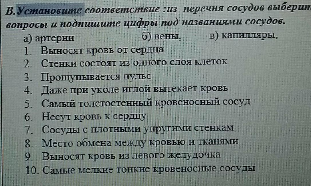 установите соответствие: из перечня сосудов выберите ответы на вопросы и подпишитесь цифры под названиями сосудов
