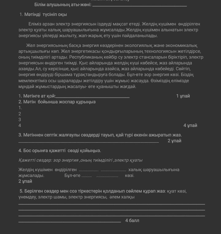 5.Еліміз ең арзан электр энергиясын іздеуді мақмат етті. Желдіңкөмегімен электр қуат көзі жұмыс жасайды. Осының арқасында әлем халқы электр шамын үнемдеді......